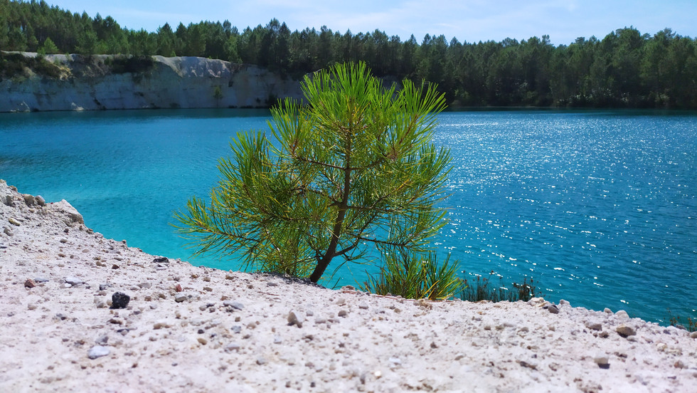 Nous sommes dans les anciennes carrières de kaolin, exploitées au siècle dernier par la société AGS de Clérac, en Charente-Maritime. La belle terre blanche, destinée à la porcelaine, aux produits cosmétiques et pharmaceutiques, a été emportée par les camions. Les trous sont restés à ciel ouvert et la pluie en a fait des réserves collinaires. « Dans ce milieu très jeune, indique le panneau d’information, l’acidité freine le développement de toute vie aquatique. N’ayant pas de vie, aucune matière en suspension ne peut absorber la lumière. Elle est donc réfléchie. »