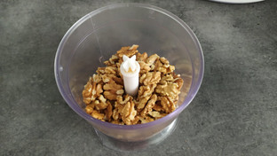 Dans un saladier, verser les poudres (noix moulues, farine, sucre, levure et sel) et bien mélanger.